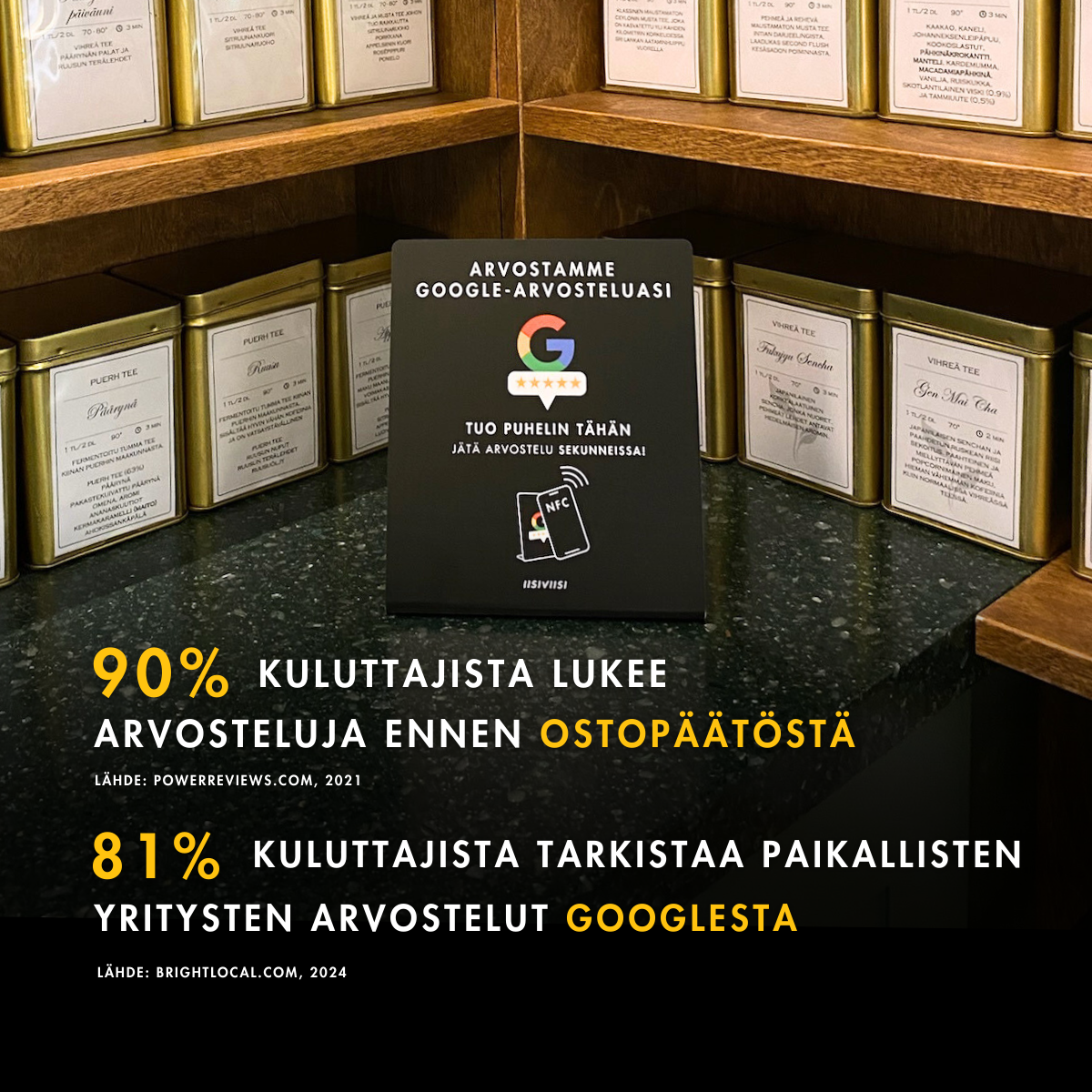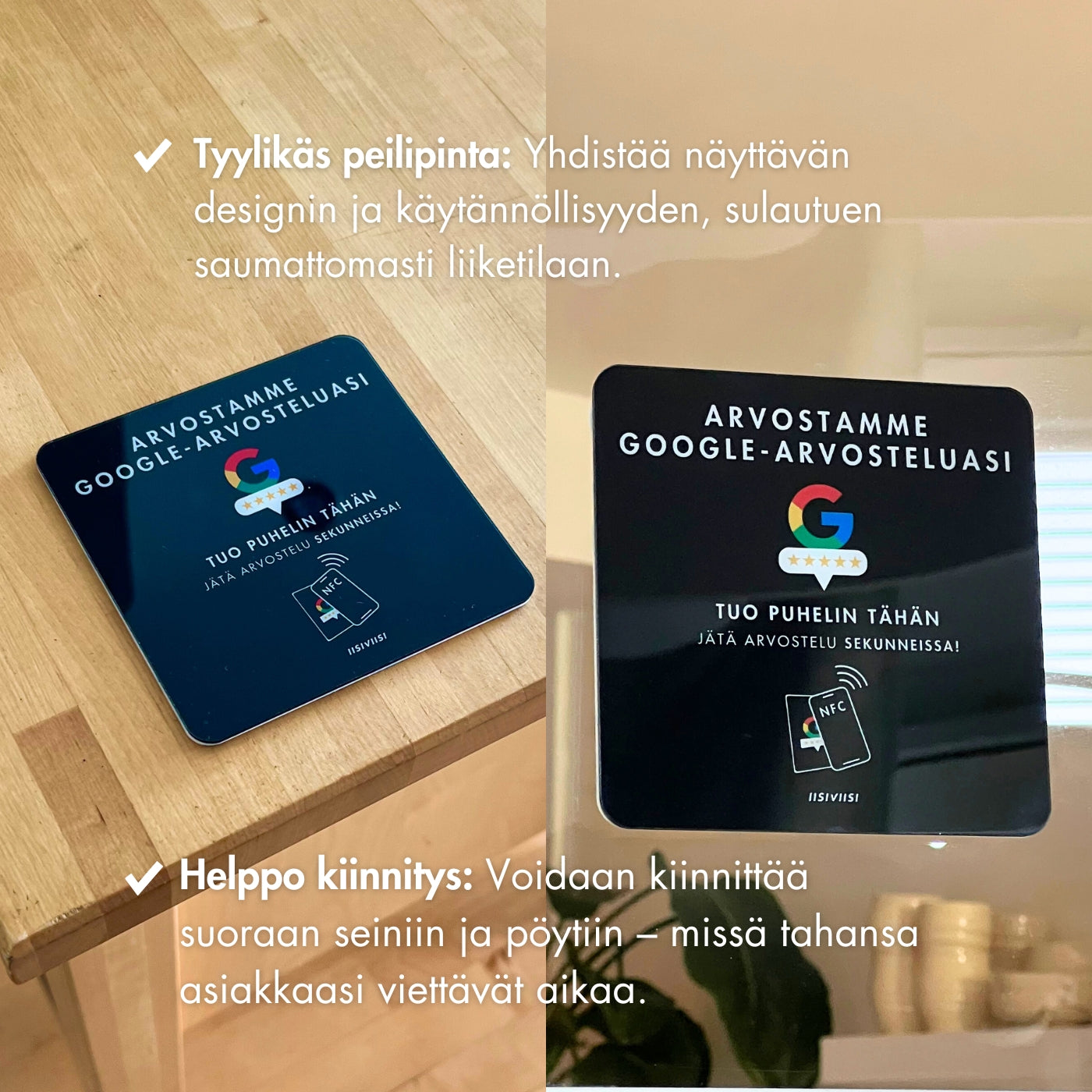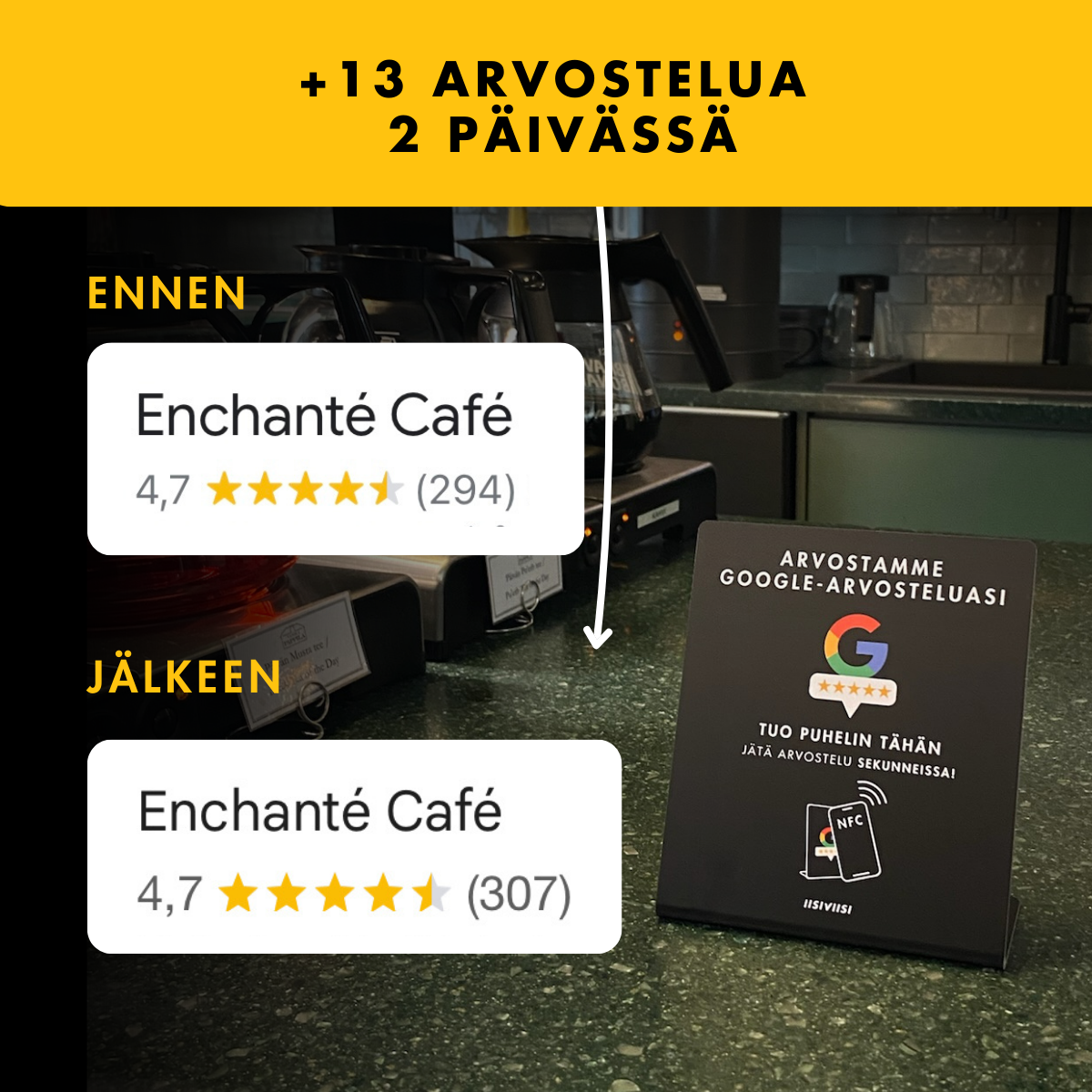 IISIVIISI käyttää NFC-teknologiaa, jonka avulla asiakkaat voivat jättää arvosteluja helposti ja nopeasti viemällä puhelimen lähelle korttia. Käytämme samaa tekniikkaa kuin Apple Pay ja Google Pay. IISIVIISI ei ole sidoksissa Googleen. Korttimme ovat työkaluja tulosten optimoimiseksi ja helpottavat asiakkaitasi jättämään sinulle arvostelun tällä alustalla.