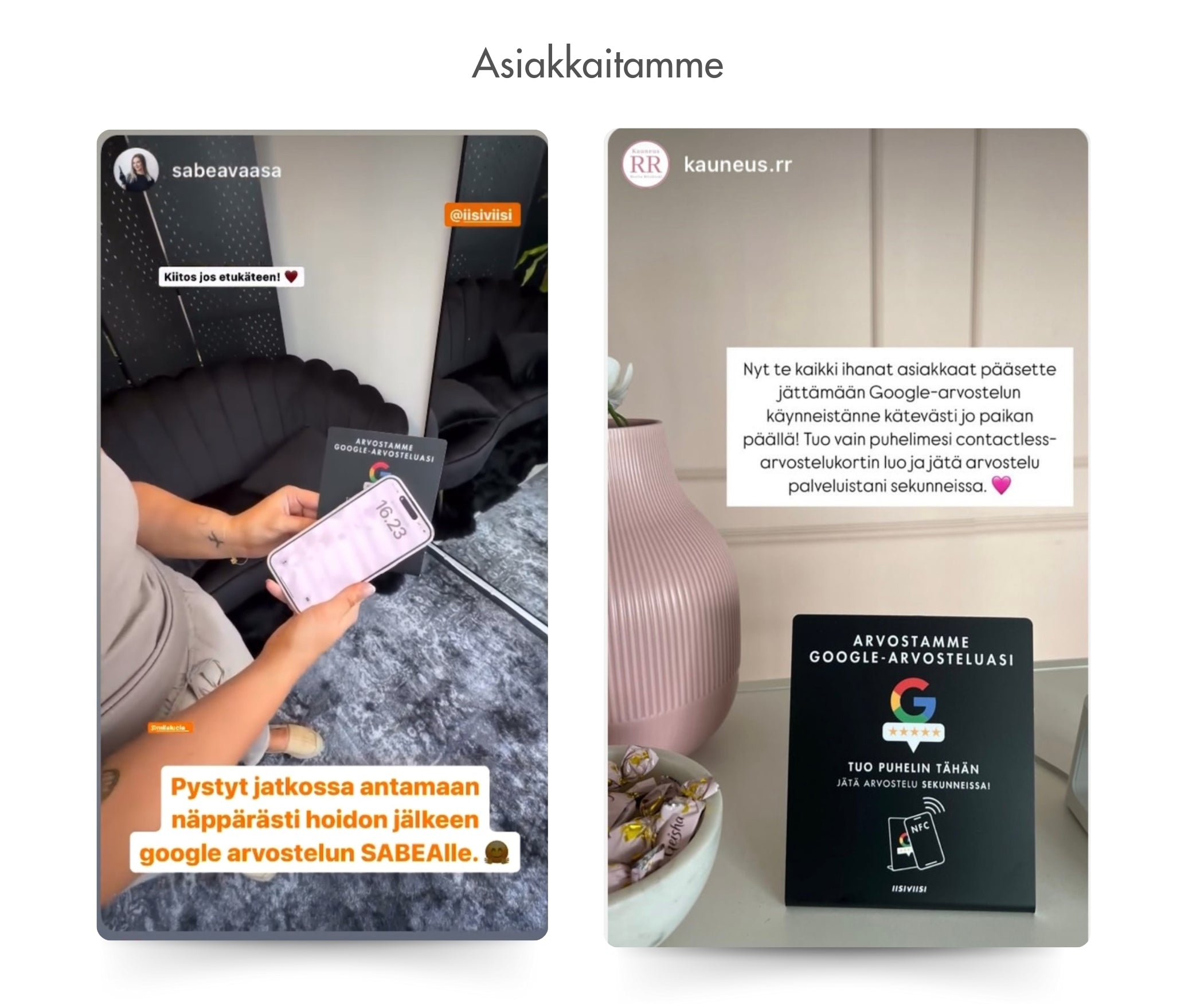 IISIVIISI käyttää NFC-teknologiaa, jonka avulla asiakkaat voivat jättää arvosteluja helposti ja nopeasti viemällä puhelimen lähelle korttia. Käytämme samaa tekniikkaa kuin Apple Pay ja Google Pay. IISIVIISI ei ole sidoksissa Googleen. Korttimme ovat työkaluja tulosten optimoimiseksi ja helpottavat asiakkaitasi jättämään sinulle arvostelun tällä alustalla.