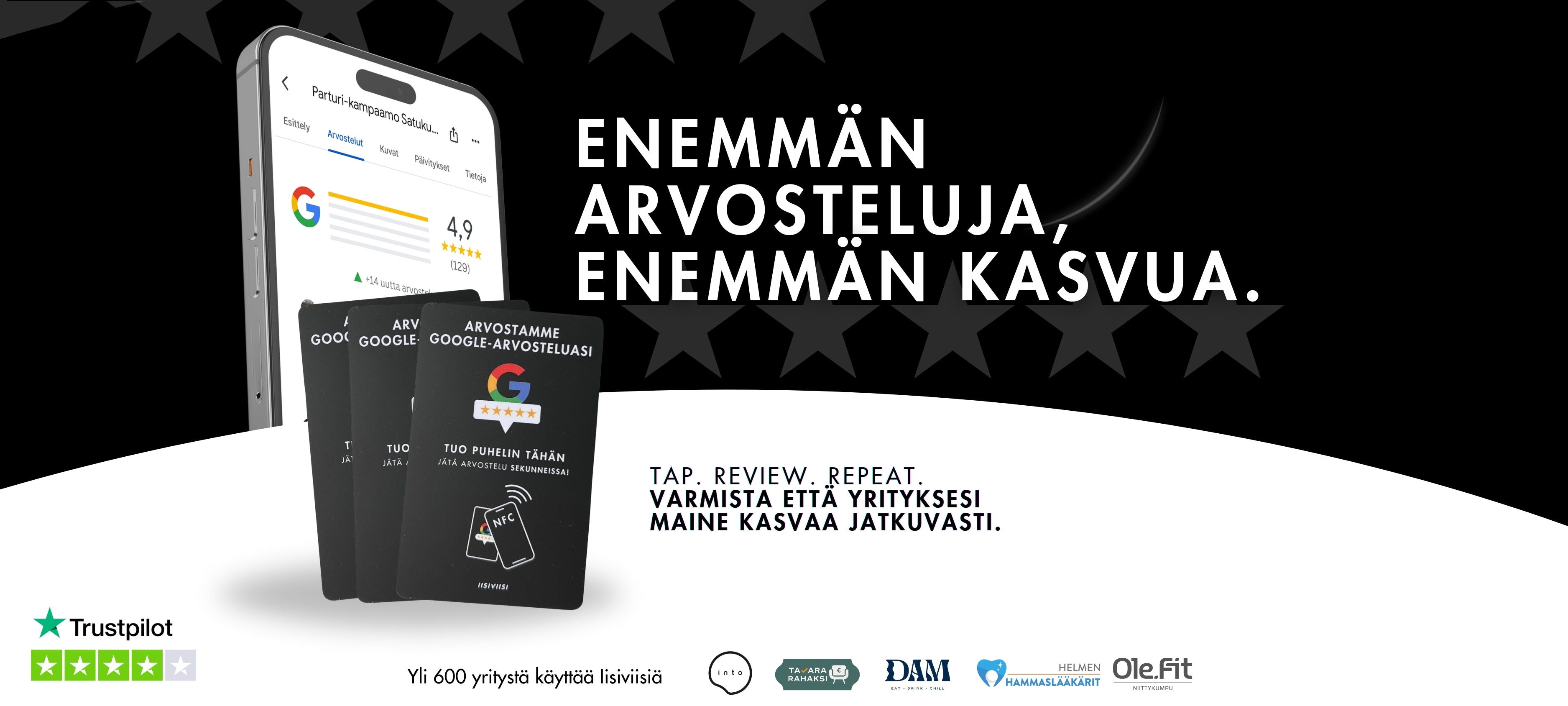Kortin sisällä oleva siru ohjaa asiakkaan suoraan Google-arvostelusivullesi, jossa arvostelun jättäminen on helppoa ja nopeaa.