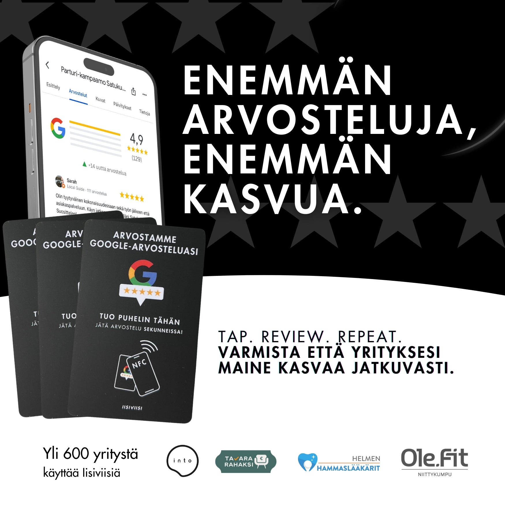 Iisiviisi toimii NFC-sirulla, joka valmiiksi ohjelmoitu yrityksesi arvostelulinkkiin.