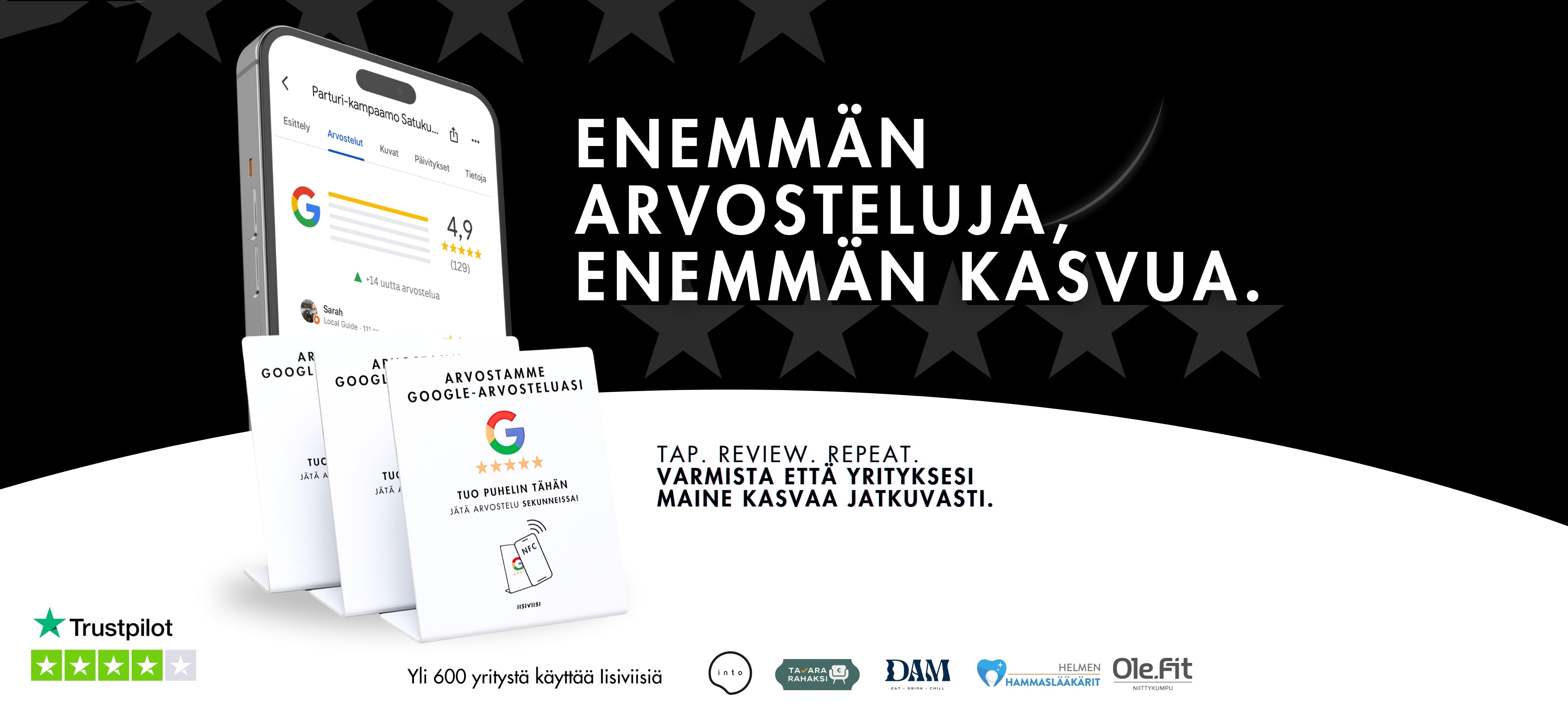 Yksinkertaisesti sanottuna: asiakkaat napauttavat korttia, jättävät arvostelun ja sinä näet Google-arviosi paranevan!