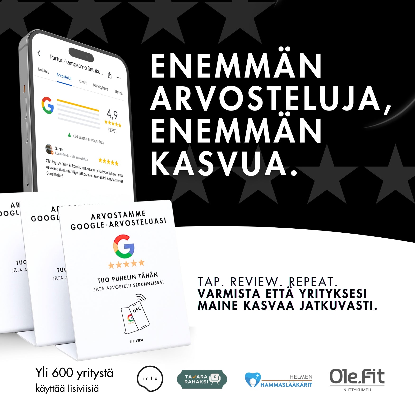 Iisiviisi toimii NFC-sirulla, joka valmiiksi ohjelmoitu yrityksesi arvostelulinkkiin.