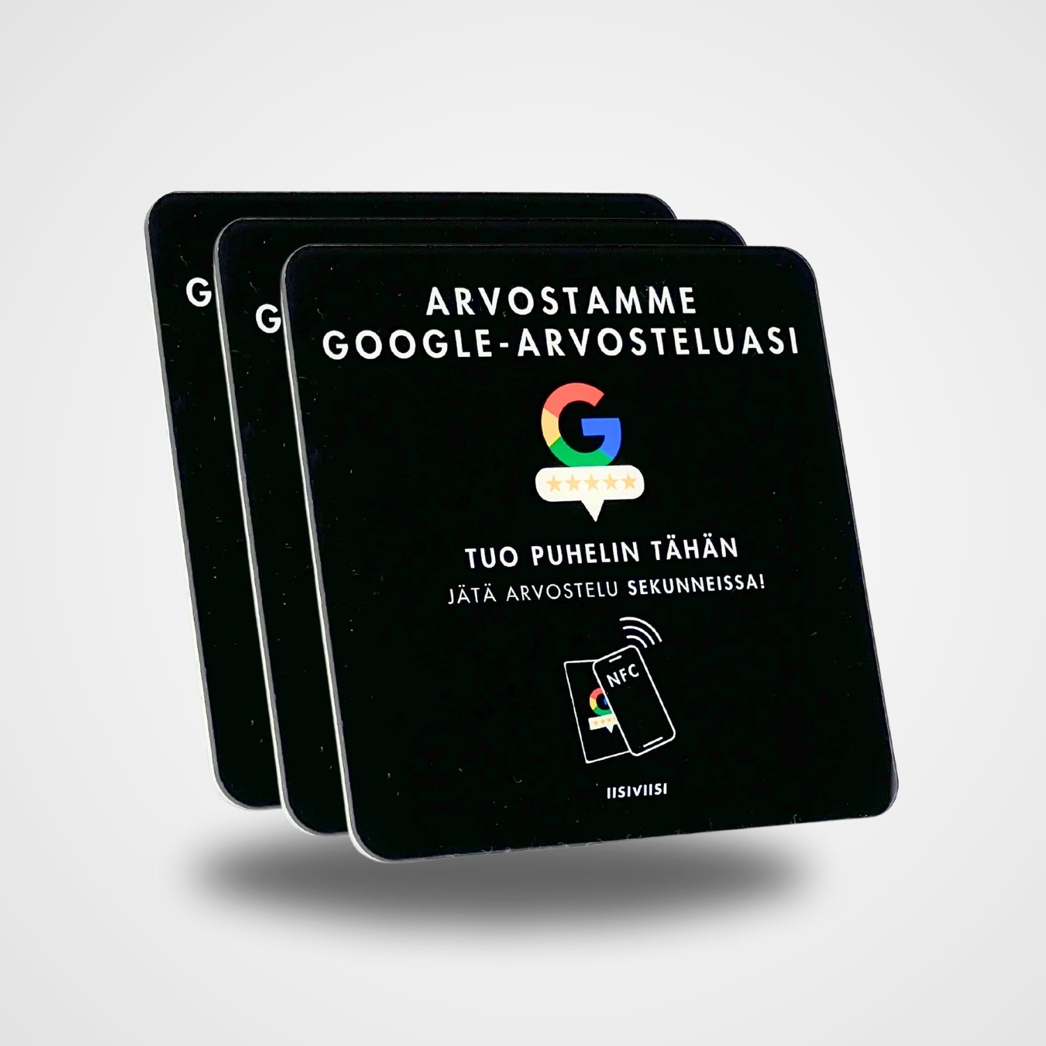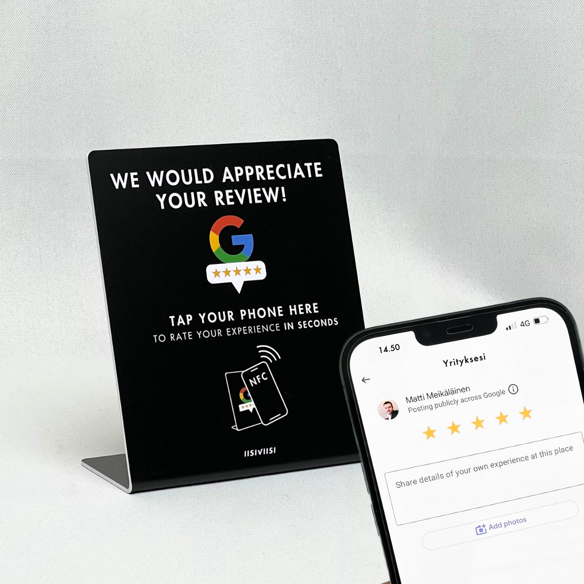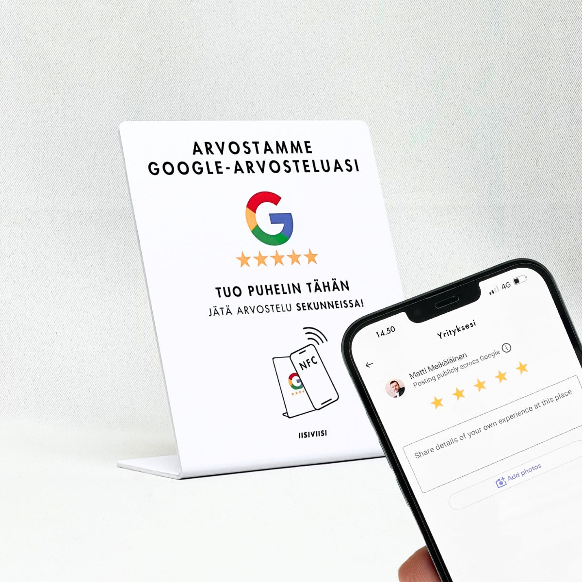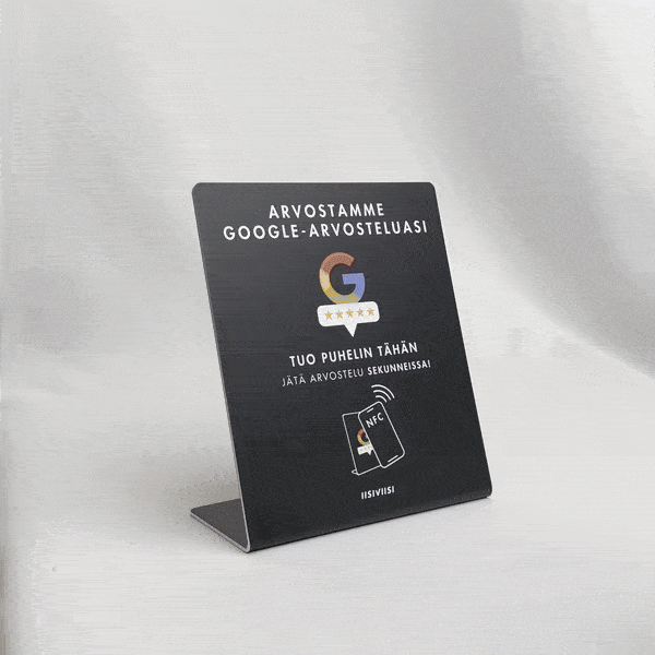 IISIVIISI käyttää NFC-teknologiaa, jonka avulla asiakkaat voivat jättää arvosteluja helposti ja nopeasti viemällä puhelimen lähelle korttia. Käytämme samaa tekniikkaa kuin Apple Pay ja Google Pay. IISIVIISI ei ole sidoksissa Googleen. Korttimme ovat työkaluja tulosten optimoimiseksi ja helpottavat asiakkaitasi jättämään sinulle arvostelun tällä alustalla.