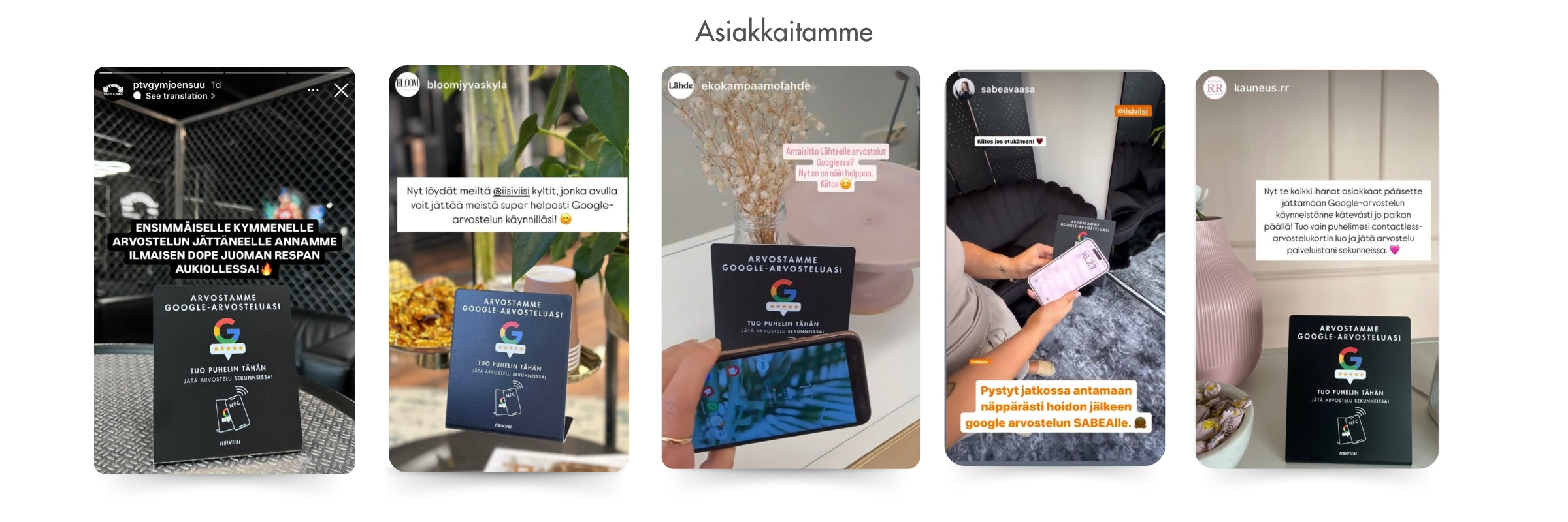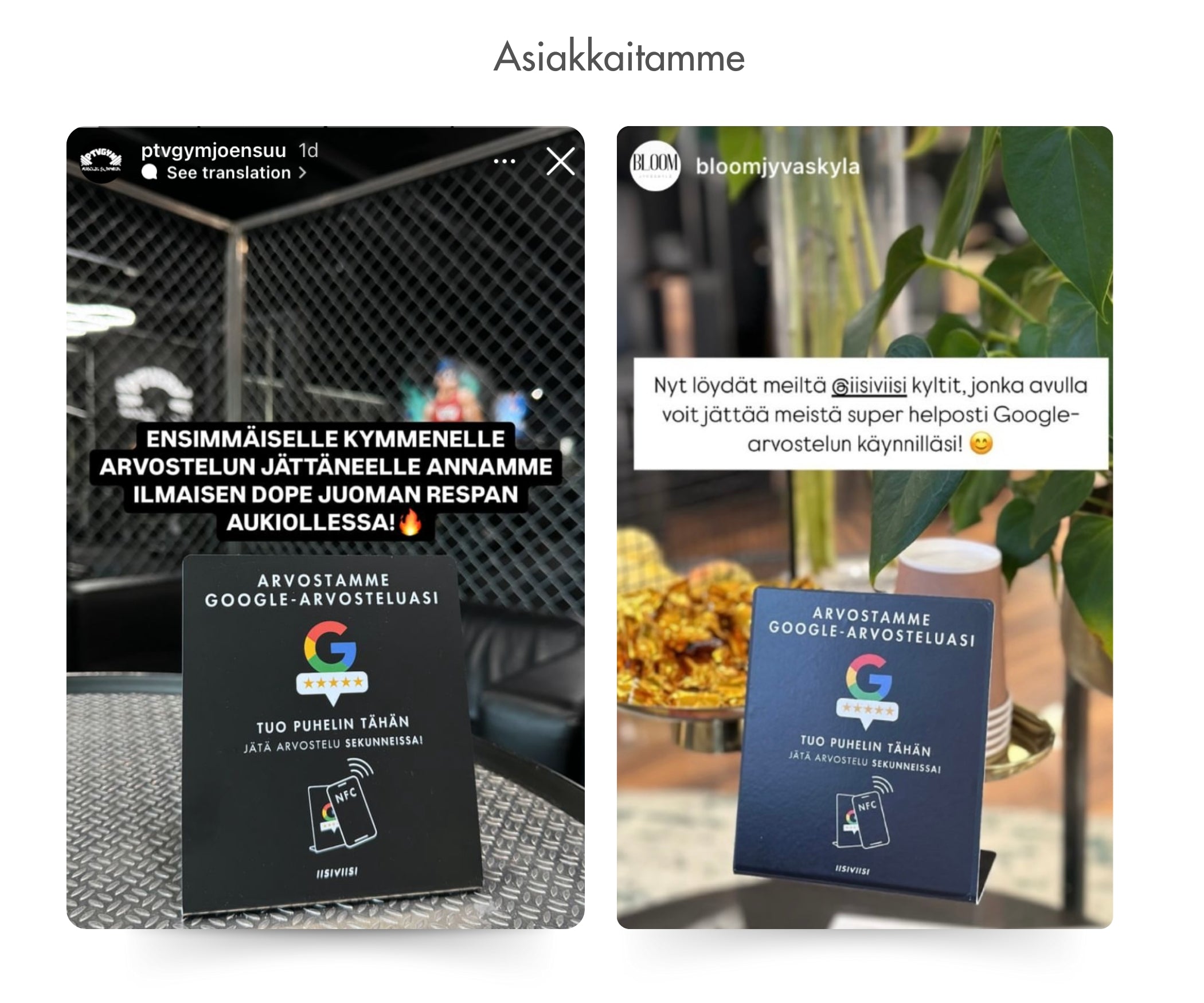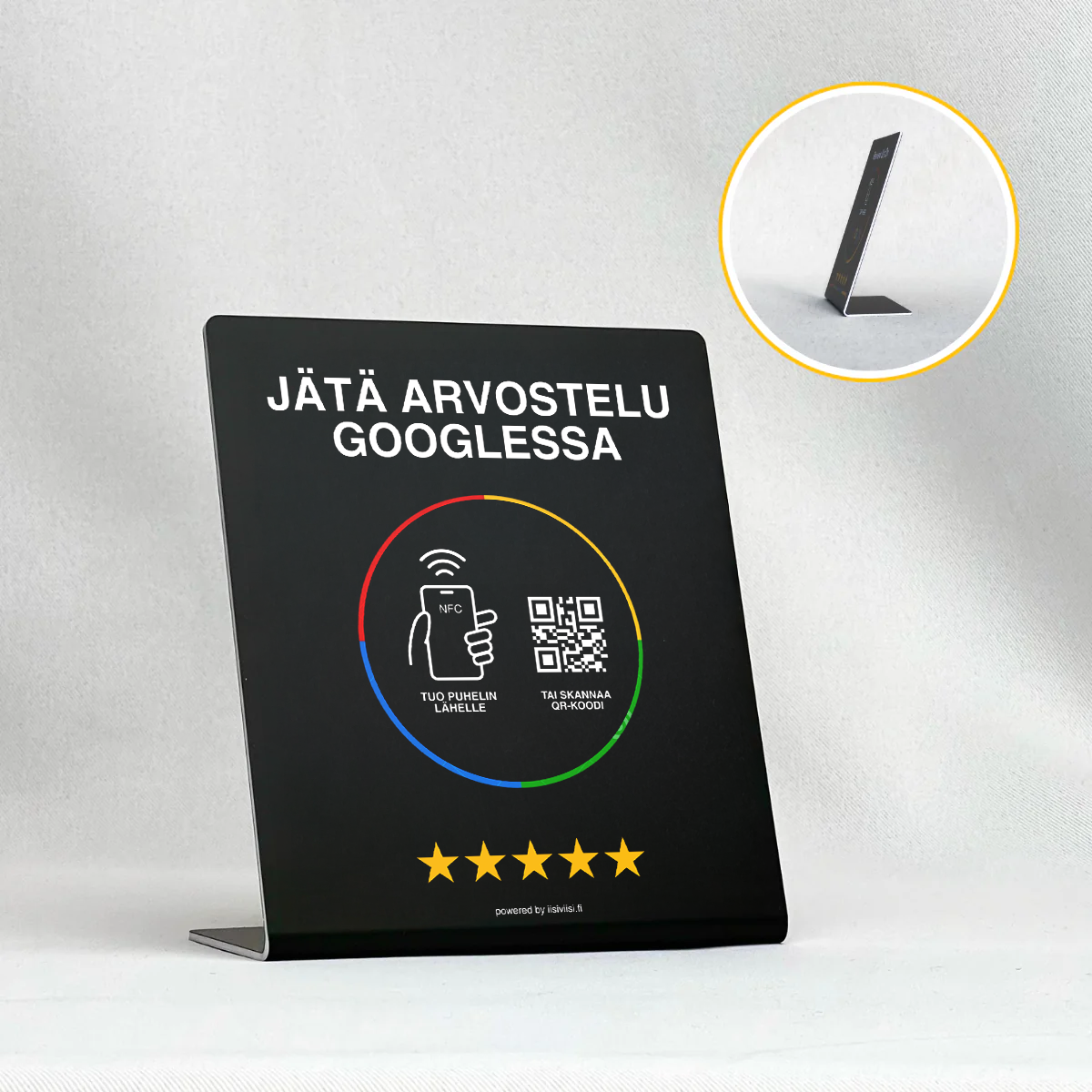 IISIVIISI käyttää NFC-teknologiaa, jonka avulla asiakkaat voivat jättää arvosteluja helposti ja nopeasti viemällä puhelimen lähelle korttia. Käytämme samaa tekniikkaa kuin Apple Pay ja Google Pay. IISIVIISI ei ole sidoksissa Googleen. Korttimme ovat työkaluja tulosten optimoimiseksi ja helpottavat asiakkaitasi jättämään sinulle arvostelun tällä alustalla.